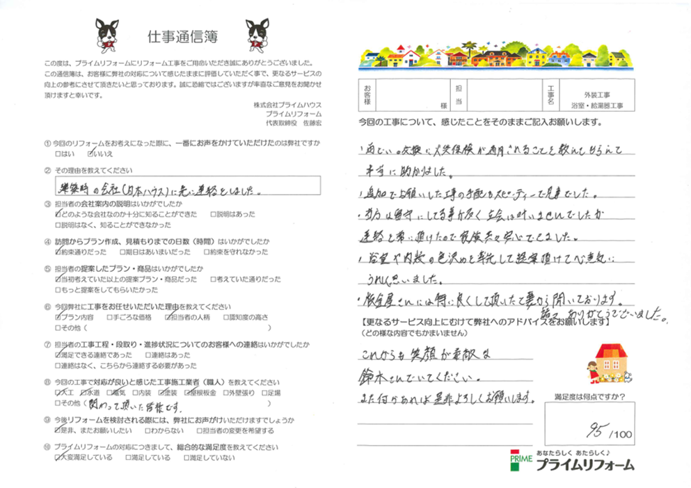 当方は留守にしていることが多く、立ち合いはかないませんでしたが、連絡も常にいただけたので家族共々安心できました。